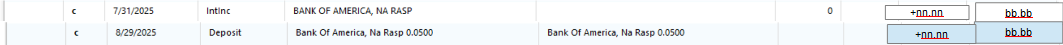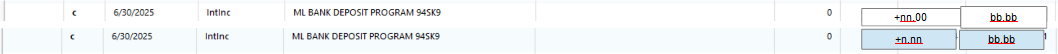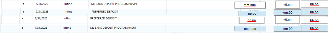 These transactions show the whole dollar and change interest for each of the 2 cash accounts separately. The mmm and ppp numbers are the totals in each of the 2 cash accounts (the change interest transactions do not increase the mmm/ppp values) and the bbb.bb is the running total of cash. At this point the account balance would be correct if the account balance did not include ppp and mmm.