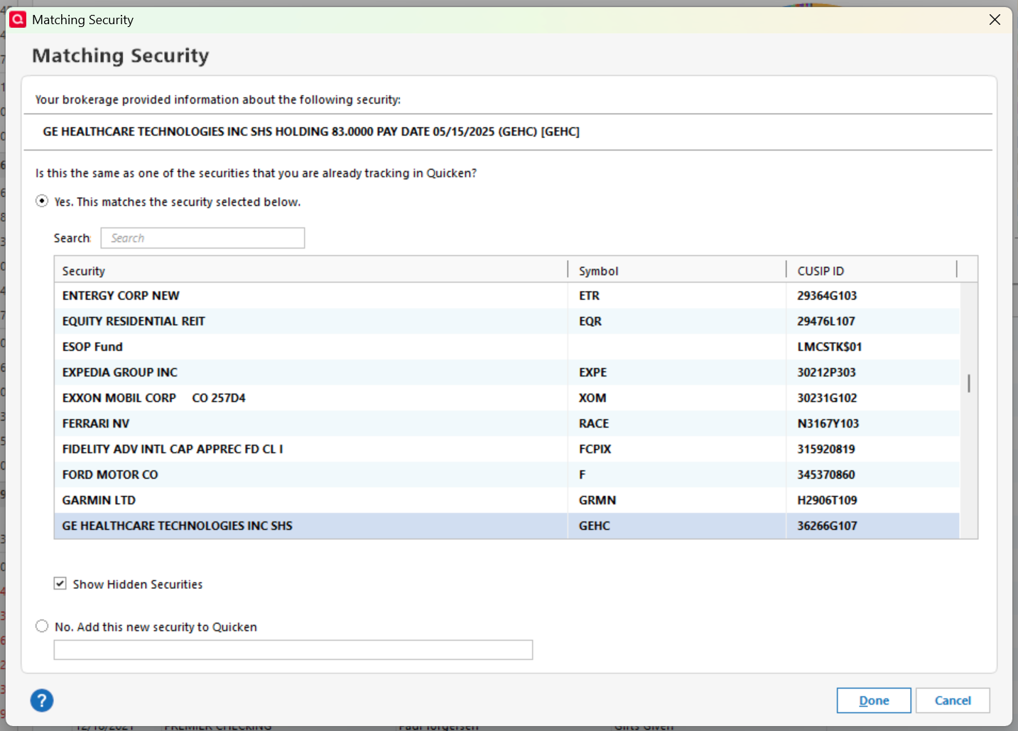It is requiring me to "match" that weird security name with something I already hold (or at least once held). So far, Quicken has always guessed right in finding a matching selection but I worry about what will happen if ML happens to purchase something in my managed IRA that I have never owned before.
