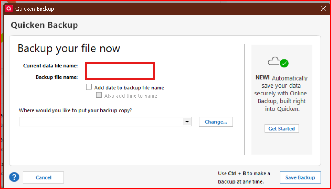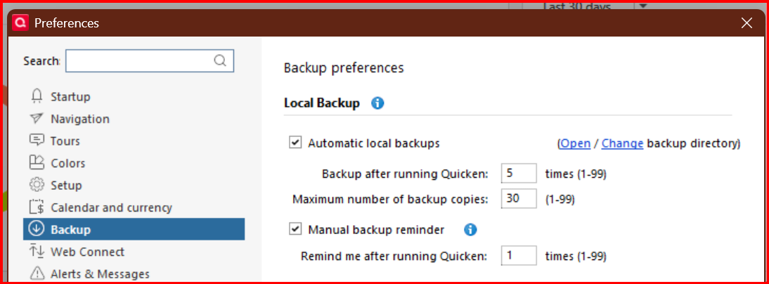 If you have automatic backups enabled, they will be saved to a default backup folder on your computer (C Drive) - Documents\Quicken\BACKUP. You can enable automatic backups and/or change the default location by clicking Edit → Preferences → Backup - Open/Change backup directory