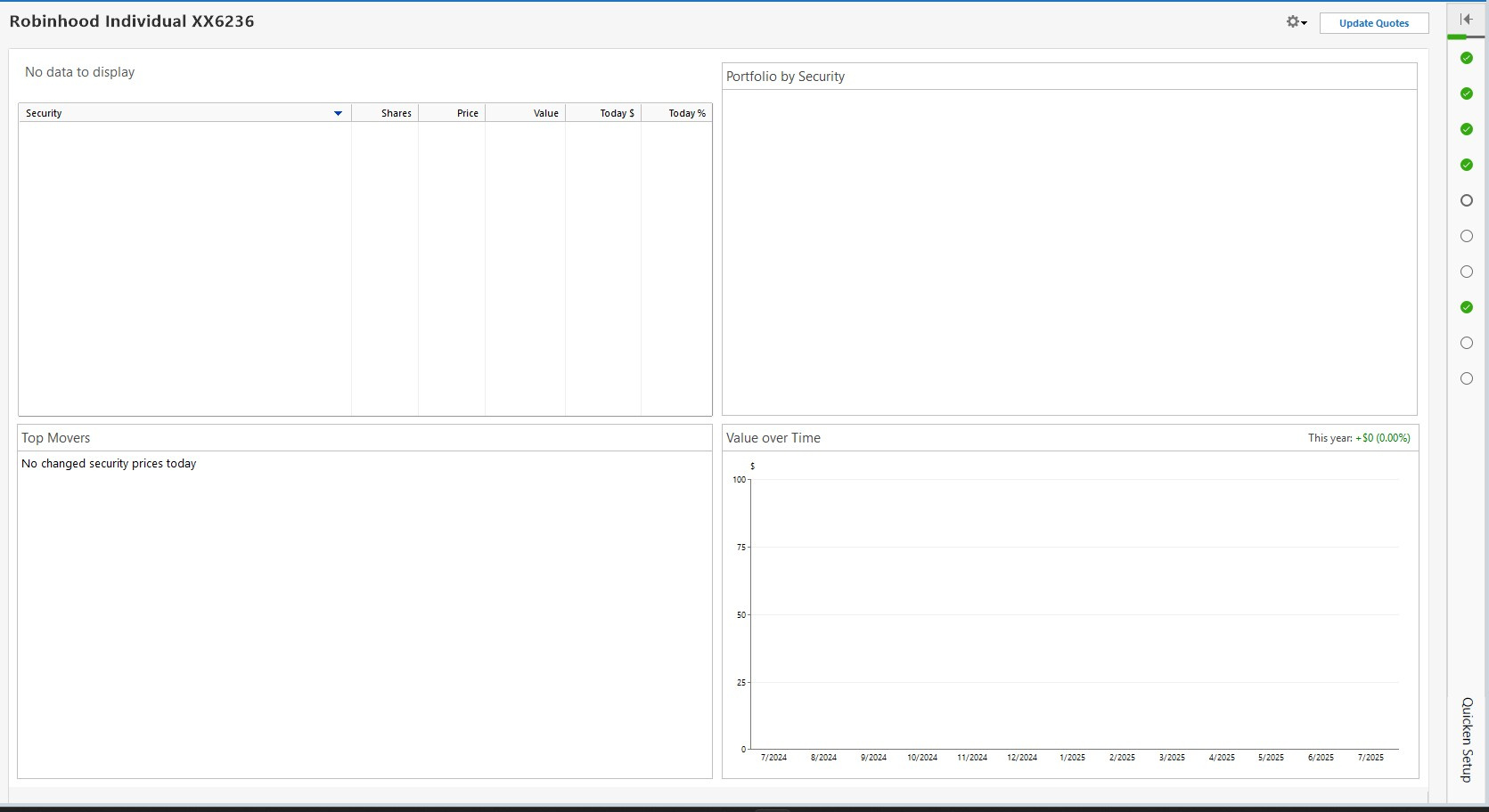New setup, earlier this month, "connects" just fine. Goes through the steps, directs me to the website, I log in, it connects, shows me my three accounts, I select my accounts, says successful and you are to return to Quicken, then takes a long while for it to load, and then the screen is just blank.