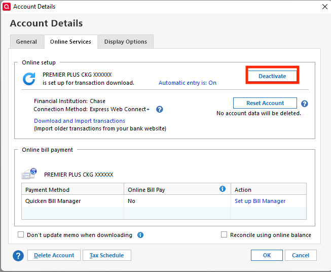 - Edit each account with this financial institution to Deactivate on the Online Services tab (if not already Deactivated)