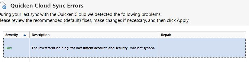 "The investment holding for investment account and security was not synced.