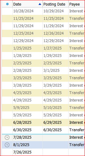 and a Posting Date = 29th (or 3/1 in February) … unless I changed the transaction's date to the 29th so I can reconcile without the interest transaction missing during Reconcile.It's really unusual for these interest transactions to be recorded on one day and posted effective the next, on a day after the statement end date.