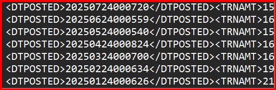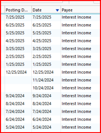 The transaction history from my American Express account also show the correct date of the 24th for the interest payments. Therefore the QFX, CSV, and transaction history from American Express all show the correct interest post date of the 24th. But, Quicken shows the 25th starting in December 2024.