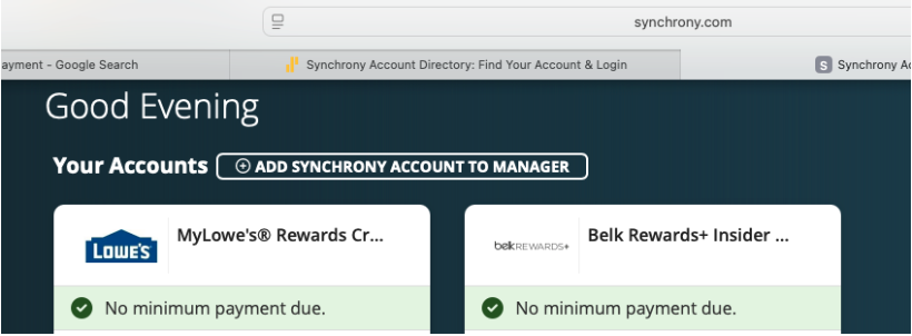 the only other URL it takes me to is Lowes.syf.com. I've tried that multiple times and it won't connect. I believe I reported that before. I am able to make a payment on the Synchrony site. I'd like to remove the Belk account from Synchrony. Apparently all of their stores have closed and they only have an online presence which my mother will not use. I can't seem to find a way to do that. At this point it's only the Lowe's card I need to add. Thanks!