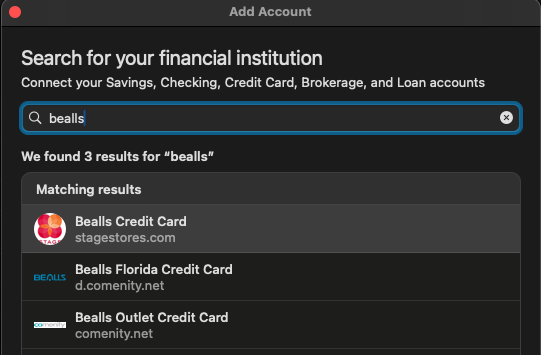 Unable to add Bealls, Belk or Lowes credit accounts to my Classic for Mac Account