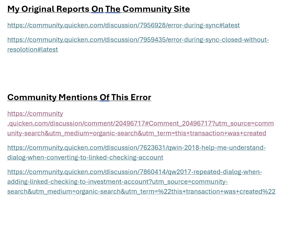I have opened this issue twice with no resolution… I have also noticed several others who have reported the same issue with mixed results. This is what I found in my case and the workaround I have found to resolve it. I am tagging all users I noticed stating they were having the issue as well as the Quicken Moderator/Help who responded.