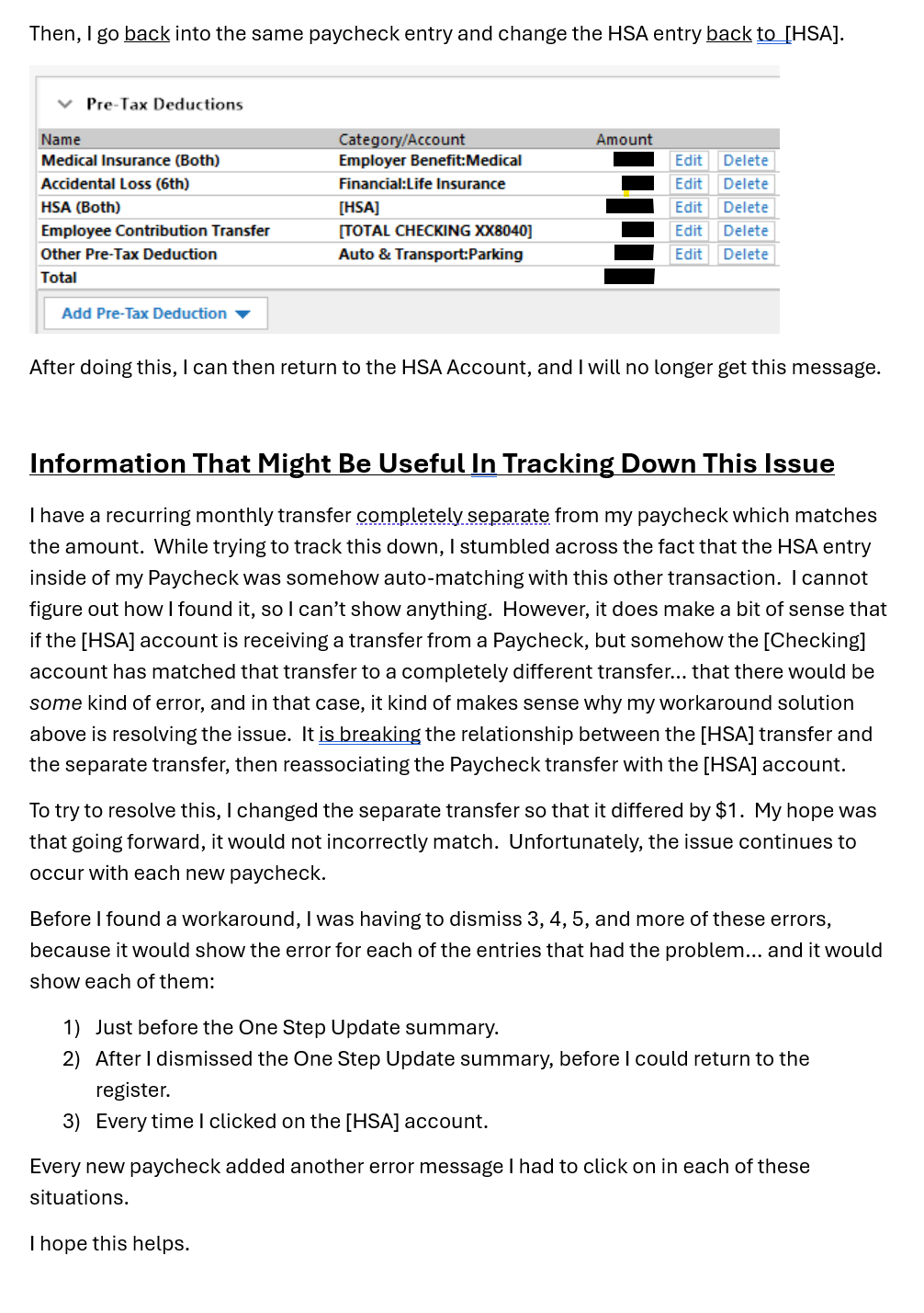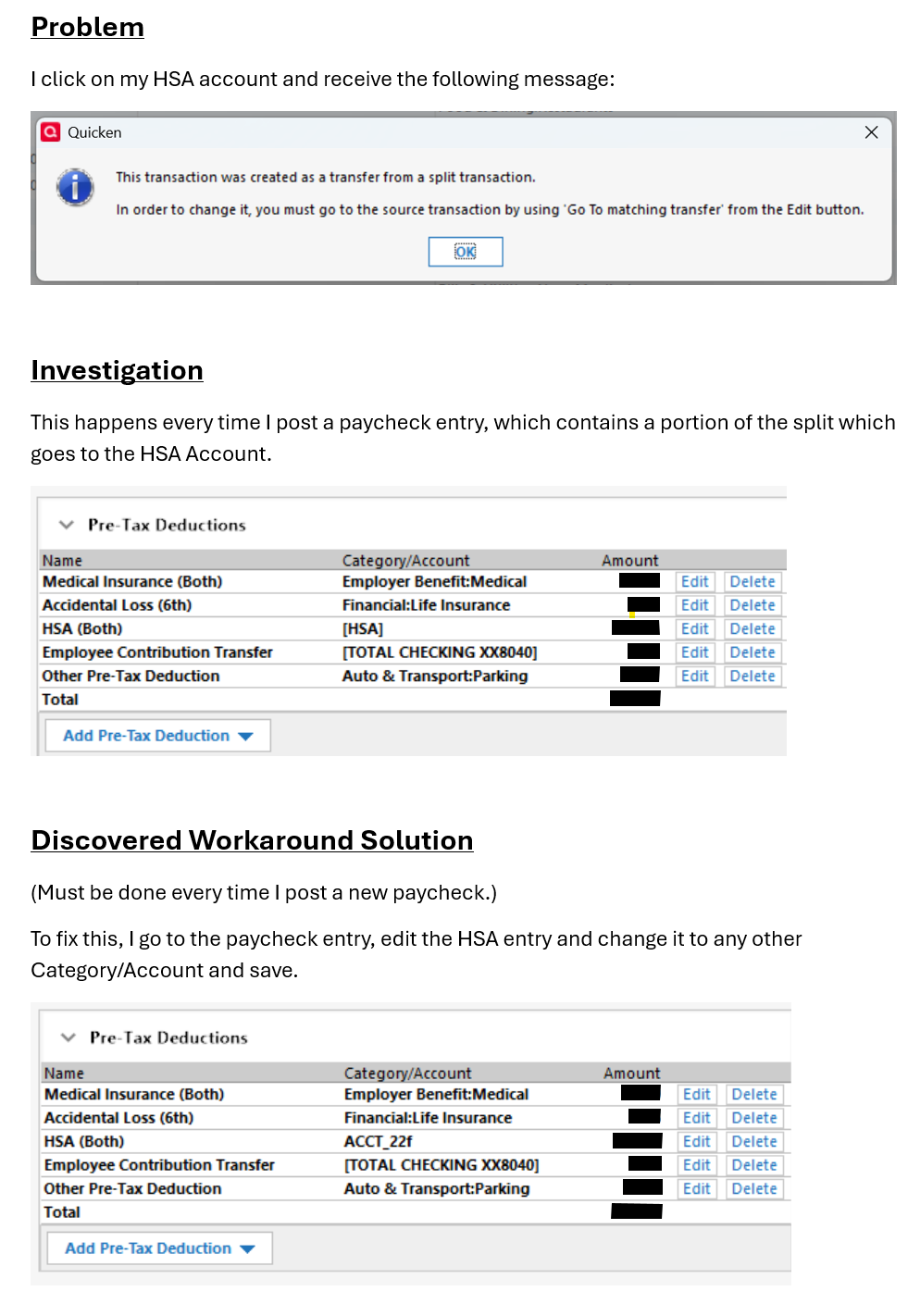 Just a suggestion - change your HSA to a banking account intent (Display Option tab in Account Details), like savings or spending. If you can't do that because it purchases securities, consider adding an HSA banking account that can transfer to the HSA investment account - you can probably automate that transfer after each paycheck with Quicken. Everything in these posts points to the fact that the HSA is considered an investment account by Quicken. While it may be an investment account, Quicken may not like to place pay income directly into investments, preferring instead to have pay income go only to banking accounts and transfers only to/from banking and investing. Quicken may only check the initial bulk transfers and not any later edits, which would explain why your workaround works. Another way to look at this: your paycheck is having your company's bank send money to your investment account, HSA, but Quicken won't (can't?) do that in one step. First the paycheck has to go to the bank, and only then can it get transferred to an investment account, in Quicken's world. I bumped into a Quicken transaction limitation in a different investment area (single mutual fund accounts) and ended up creating a fake category, as I suggested above, to perform the necessary financial moves. Good Luck!