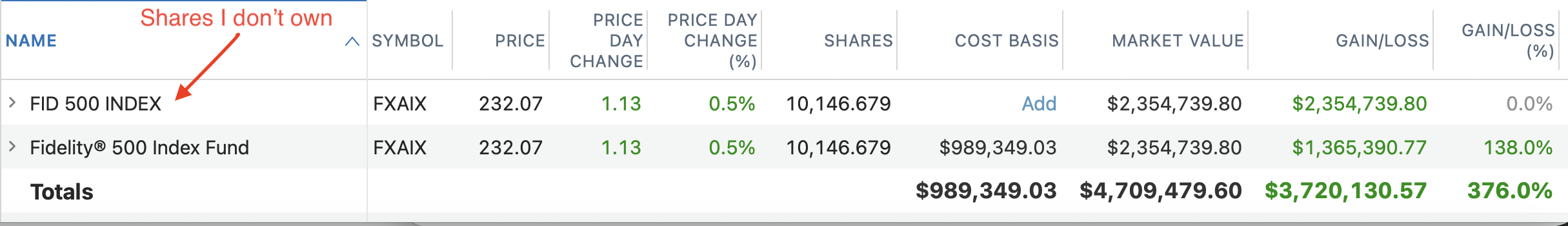 Though the stock symbol is the same, in my case it is FXAIX, but the stock description is different from the equity I actually own. This causes my portfolio value to double.