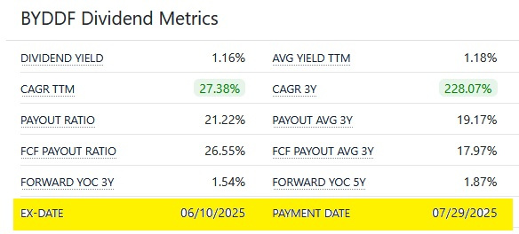 • BYDDF (Class H) declared a 3-for-1 stock dividend, with a record date of June 11, 2025, and a payable date of July 29, 2025. Shareholders will receive 2 additional shares for each 1 held, for a total of 3. (Source: Attached BNY Investor Disclosure)