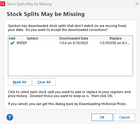 • On June 10, Quicken downloaded a 1-for-0.6 split into my BYDDF (Class H) holding. This suggests a reverse split, which never occurred.