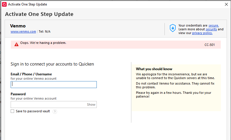 Clearly the Quicken software is aware that is not properly reaching out to Venmo. It even requests that I do not reach out to Venmo!!
