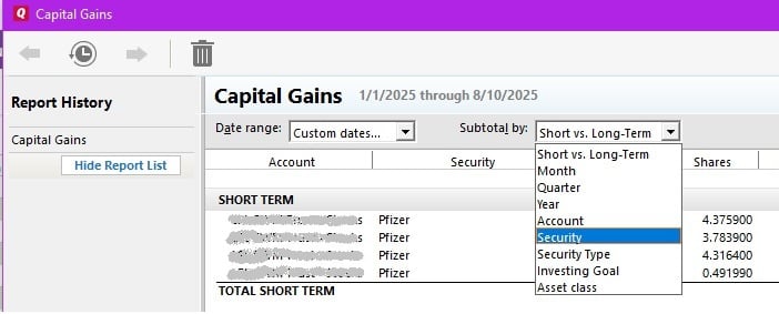 In my Capital Gains report, I would like to collapse the individual transactions, and only see the subtotal for security. I have this option in e-Trade, and can easily do it in excel. But have not been able to figure it out in Quicken Classic Deluxe.