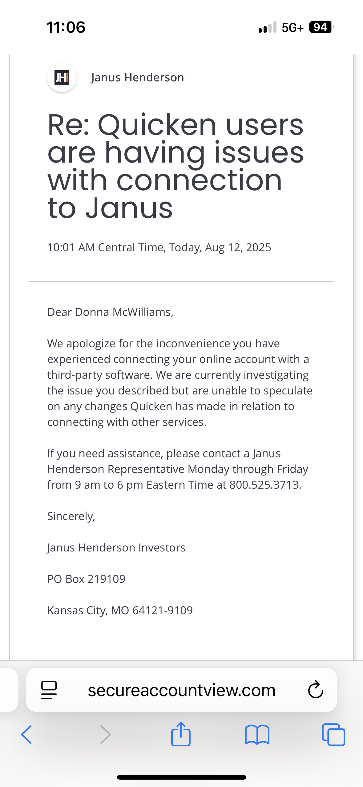 Could Quicken not at least report the issue to Janus on behalf of all Quicken users affected? We don’t have assess to the servers or info being transmitted by them either but Quicken is in a better position to report and explain the issue to Janus.