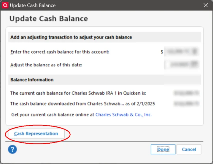 In our 8 Schwab Accounts in Quicken our two brokerage Accounts do not show that