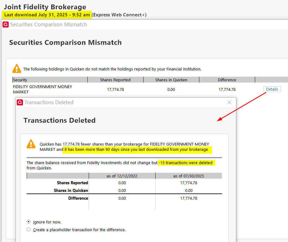 I like to track my cash as cash in my Fidelity brokerage account, even though it's really in a money market fund. This worked fine until the recent switch from DC to EWC+. Now QWin complains that there's a mismatch. And its messaging is very strange, e.g., "-15 transactions were deleted".