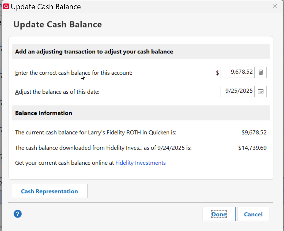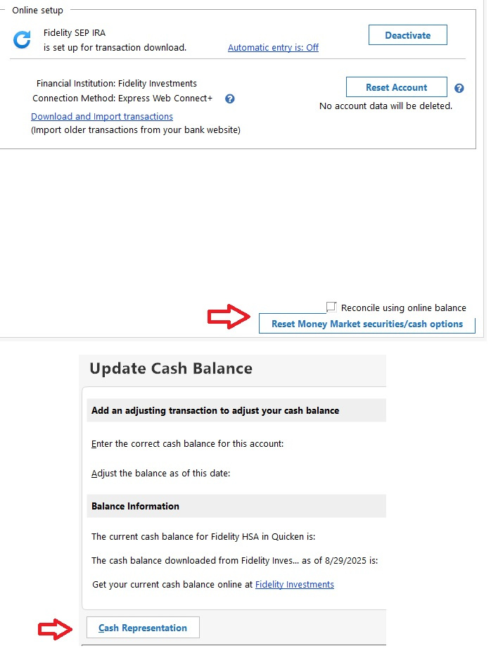 Glad this is mostly working for you. Unfortunately, it is not for me. Quicken has never presented a Cash Representation option for any of the accounts. I am using a test datafile and version R64.25 . However, all Fidelity accounts are downloading transactions.