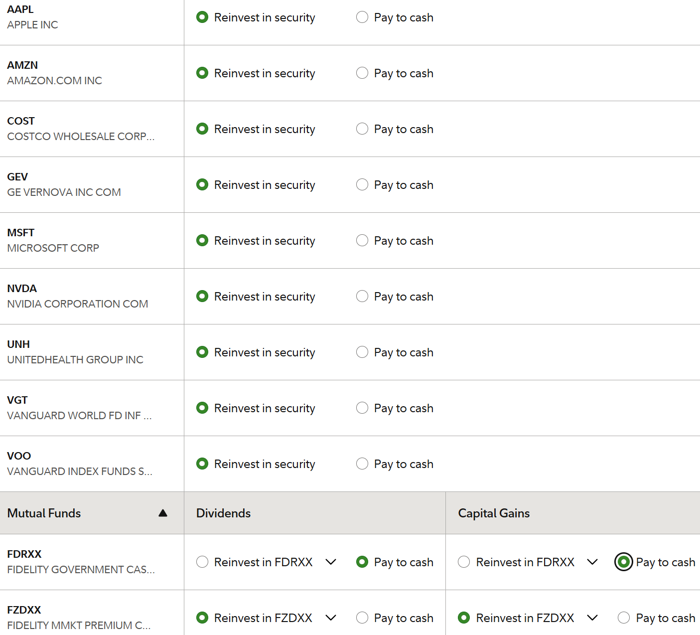 Beside the missing Cash Representation buttons on 3 of my 15 Fidelity accounts, the most recent end of month dividends to the Core / Sweep / Cash balances came across into Quicken as ReinvDiv (in a position) rather than what should have been Div to Cash transactions. I took care of that by deleting the ReinvDiv's and hand-entering Div transactions to make the Cash come out correct and not establish fictitious security positions. It's been a while since I looked at the Manage Dividends view in Fidelity's website. When I examined that, I was surprised to see Dividends and Capital Gains for the Core Cash Fund set for Reinvest rather than Pay to cash. I don't know if this is a new option in their accounts and it defaulted to Reinvest. Anyway, I'm setting the Core Funds to Pay to Cash, and leaving everything else to Reinvest. I'll have to wait until the end of October to see if this resolves the undesired "ReinvDiv to Core" issue. Note I have some other, non-core Cash Mutual Funds, beside the Core Cash Balance Fund. An example of one account is shown here (Core is FDRXX, Other is FZDXX):