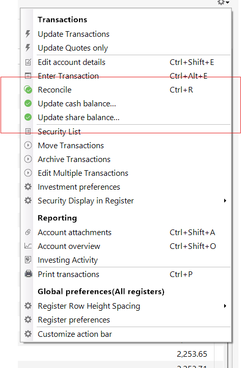 Has this been recently removed? The reconcile shown just does it for all transactions, there was a separate menu choice for recon on the shares balance (it still does this automatically after a download, but I can't do it manually now).