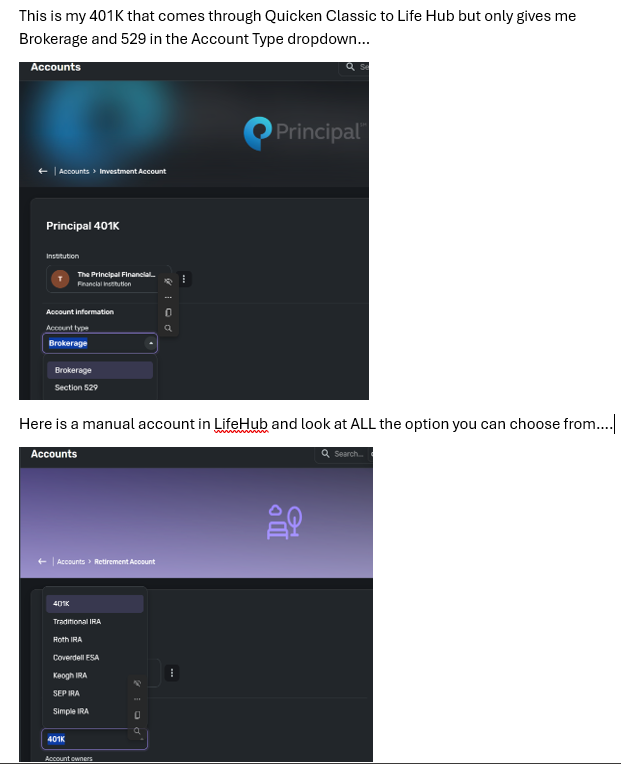 Hello Team. I am using LifeHub and have my Quicken Classic Windows (R63.21) synced to Lifehub feeding my accounts. I found a problem with LifeHub. If you create a manual Retirement account in LifeHub you get the option to select a variety of types (401K, Roth, IRA etc..). However, my 401K in Quick Classic syncs over to LifeHub as just an "Investment". I don't get to recategorize it to a Retirement. This is a flaw. Please see my image