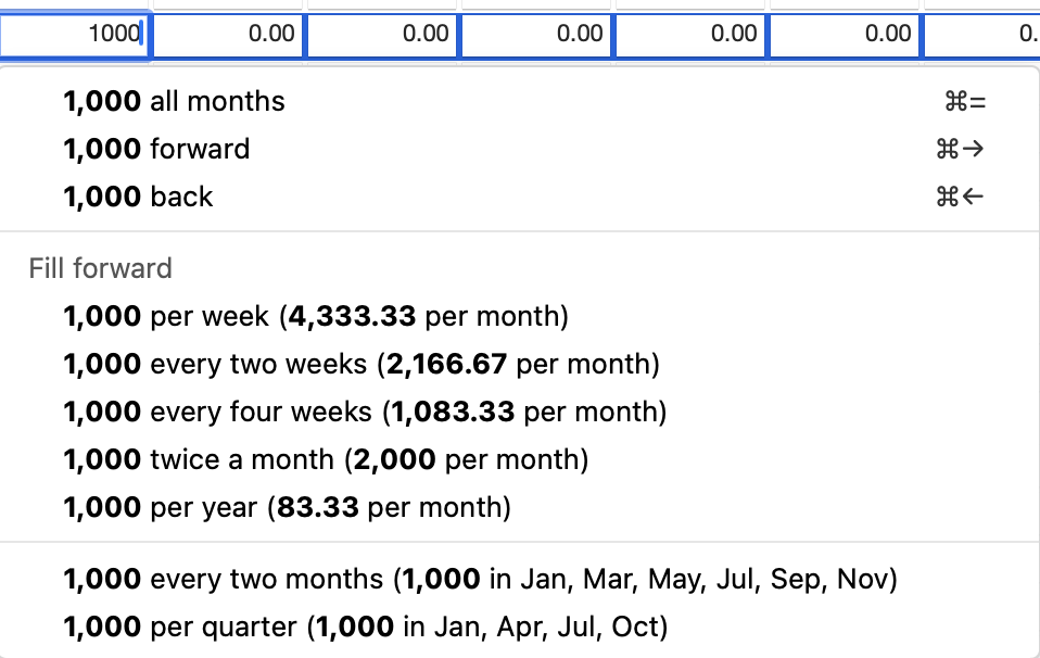 @bdkauff You don't need to do the math to calculate your monthly budget amount. Let's say you have a category in which you spent $1,000 last year (or otherwise want to budget $1,000 this year); if you type 1,000 into the first (January) cell for that category, there's a pop-up window with lots of options: