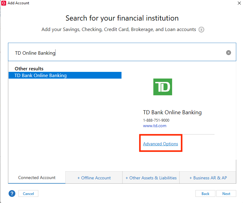To correct that, first, backup your file. Then, make sure the problem account is deactivated. Go to Tools>Add Account. Search for TD Bank Online Banking. Click the Advanced Options link.