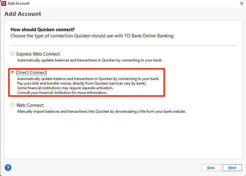 When I try to de-activate and then re-activate the account, this time using "advanced options" to ensure that "Direct Connect" is selected, I also receive a CC-555 error that states that my financial institution is blocking Quicken from accessing my account. Again, TD Bank denies that it is blocking quicken.