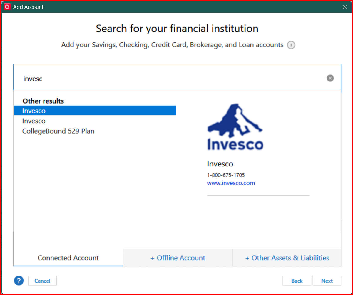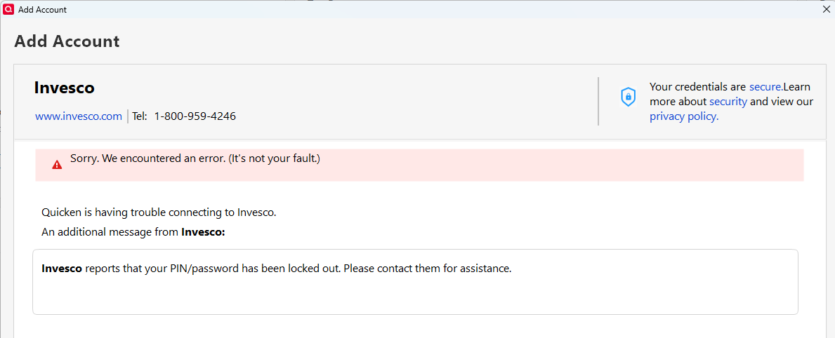 @MGB when I try to add Invesco as a new account, I noticed that there are two identical Financial Institution Names listed. Have you tried setting up your new account with each of them? Do you get the error message for both?
