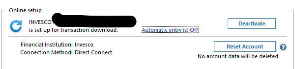 @MGB it looks like there are two different connections with Invesco. They have identical Financial Institution Names on Quicken (Invesco). That is making it difficult to know which connection you are using. It looks like now you are using the one for EWC which seems to work. But, from what you are saying, you really want to use the connection for Direct Connect (DC).