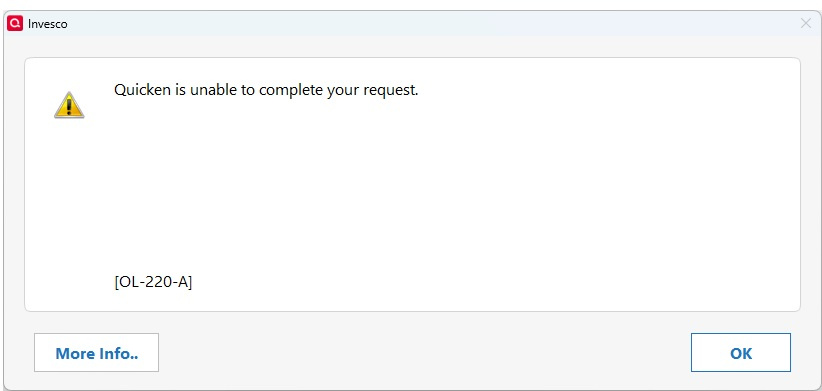 Thanks for all the detailed updates. The info provided by @CaliQkn is accurate, especially regarding the OL-220-A error and the importance of contacting Invesco directly, as this error typically originates on the financial institution’s servers. The support article shared earlier also outlines what you can try on the Quicken side, but resolution will ultimately require Invesco’s assistance.