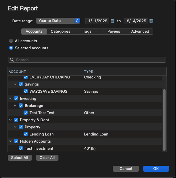 - Optionally go to the Tags or Payees tab if you want to further filter the report.