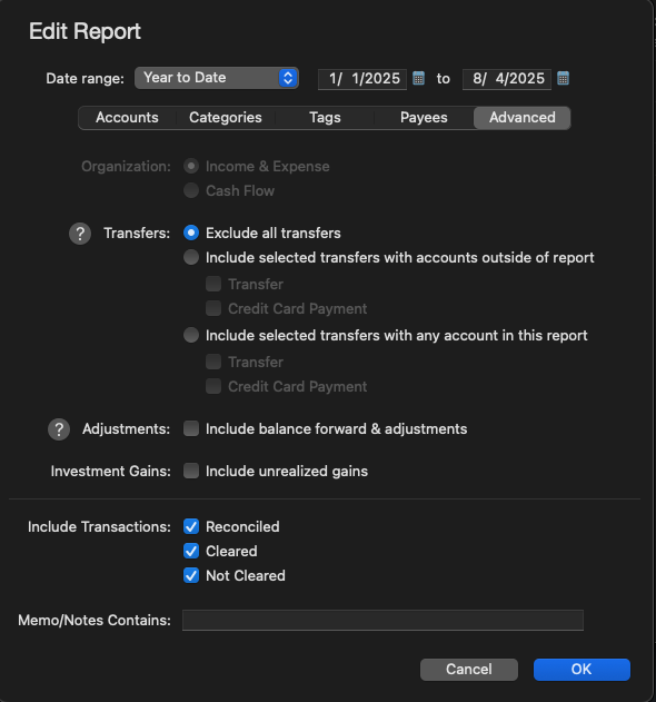 - Leave the other options (Adjustments, Investment Gains, etc.) unchecked unless you have a reason to include them.