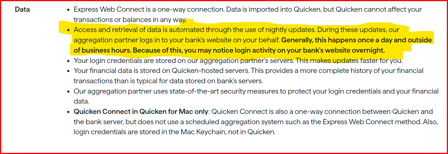 I receive alerts from my credit union when my accounts are accessed on line. I have that alert set for security purposes. Every day for the last several days, I get a notice that someone has logged into my account. When I checked with my credit union, they told me it was Quicken. Why do you do this? I only want you to access my accounts when I activate the One-Step Update feature in my Quicken Classic. Do you do that to all the accounts for which I have saved login credentials in my Quicken Classic program?