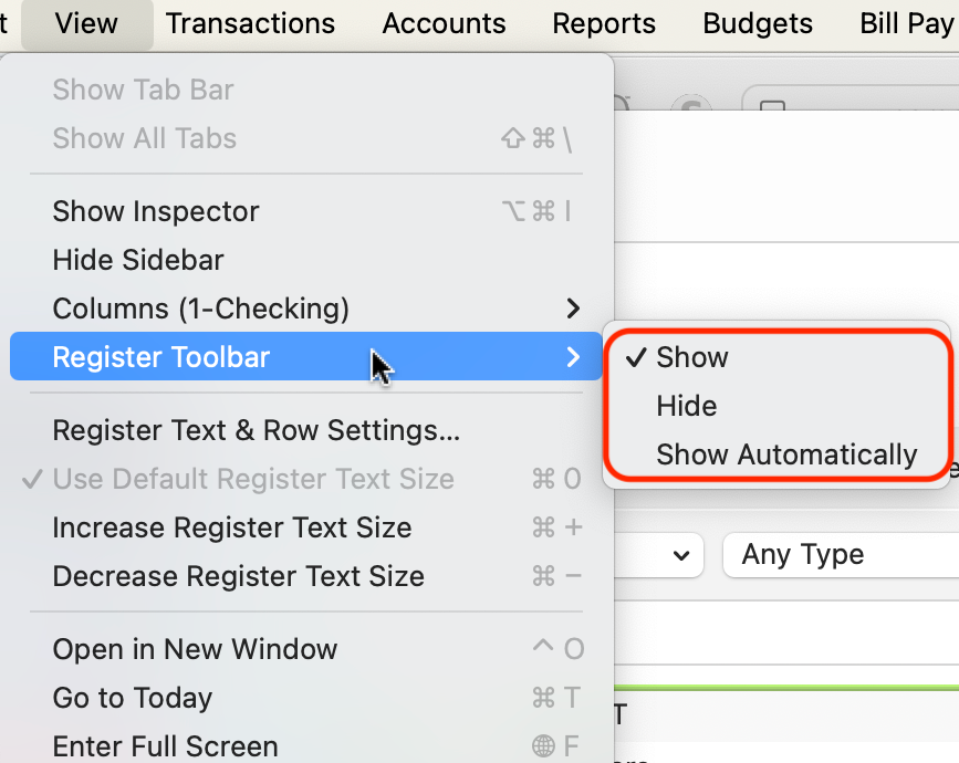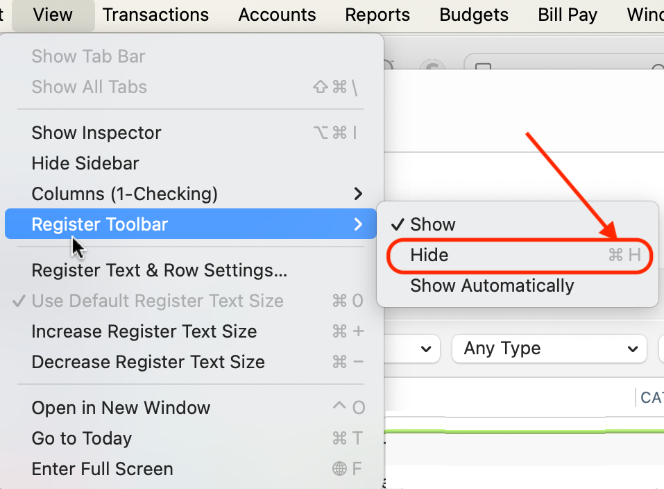 Does your Quicken > Hide Quicken menu item show the Command-H shortcut as picture above, or is it missing? You mention that Command-H hides the register toolbar for you. That isn't the standard configuration of Quicken Mac; as you can see here, there are no Command keys assigned to the Register Toolbar > Hide menu command: