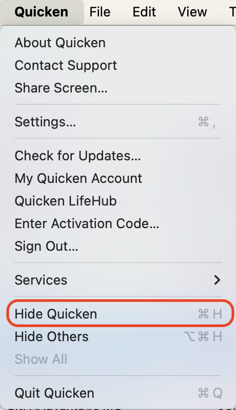 For years and years I've been frustrated that when I click CMD+H, Quicken only hides the register toolbar, not the entire Quicken window. Every other app I use has this feature! I've searched for ways to customize keyboard shortcuts in Quicken, but I'm not sure that features is available, either.