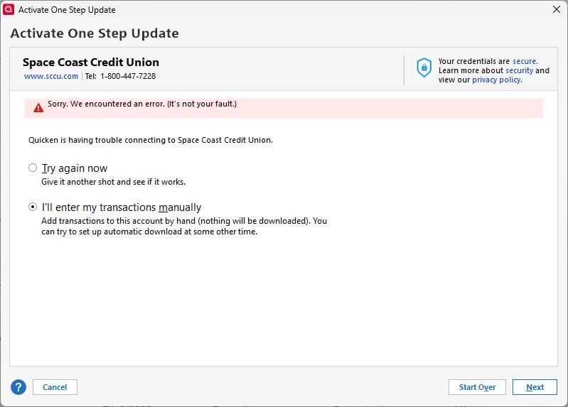 As a last test before I let this go for a few days: I created a virgin .qdf file. I tried to add my SCCU accounts; I selected SCCU in the Add Accounts wizard, and when it went off to find my accounts, it also came back with the dreaded "Sorry. We encountered an error. (It's not your fault)."