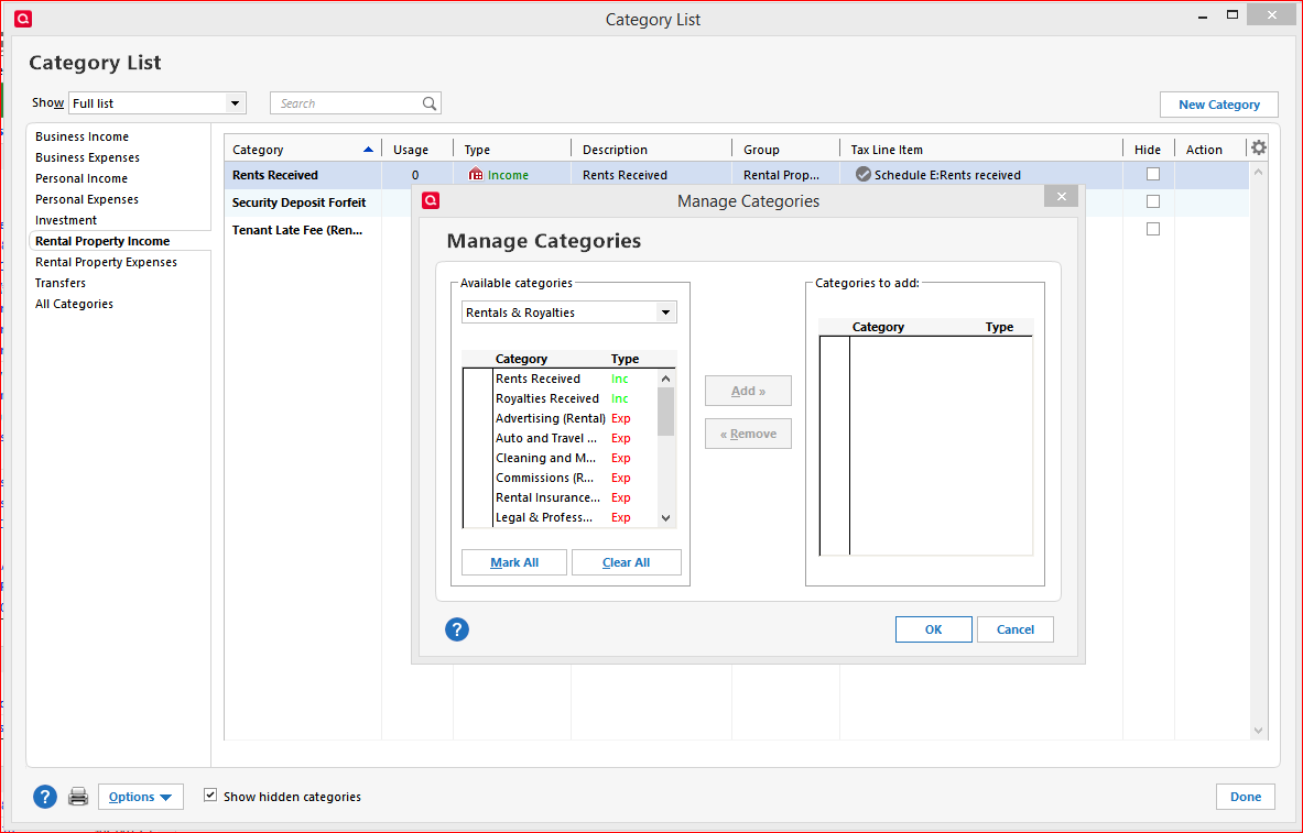 Click the Options button, click Manage Categories.In the box on the left side select Rents & Royalties to see the list as shown in the image.
