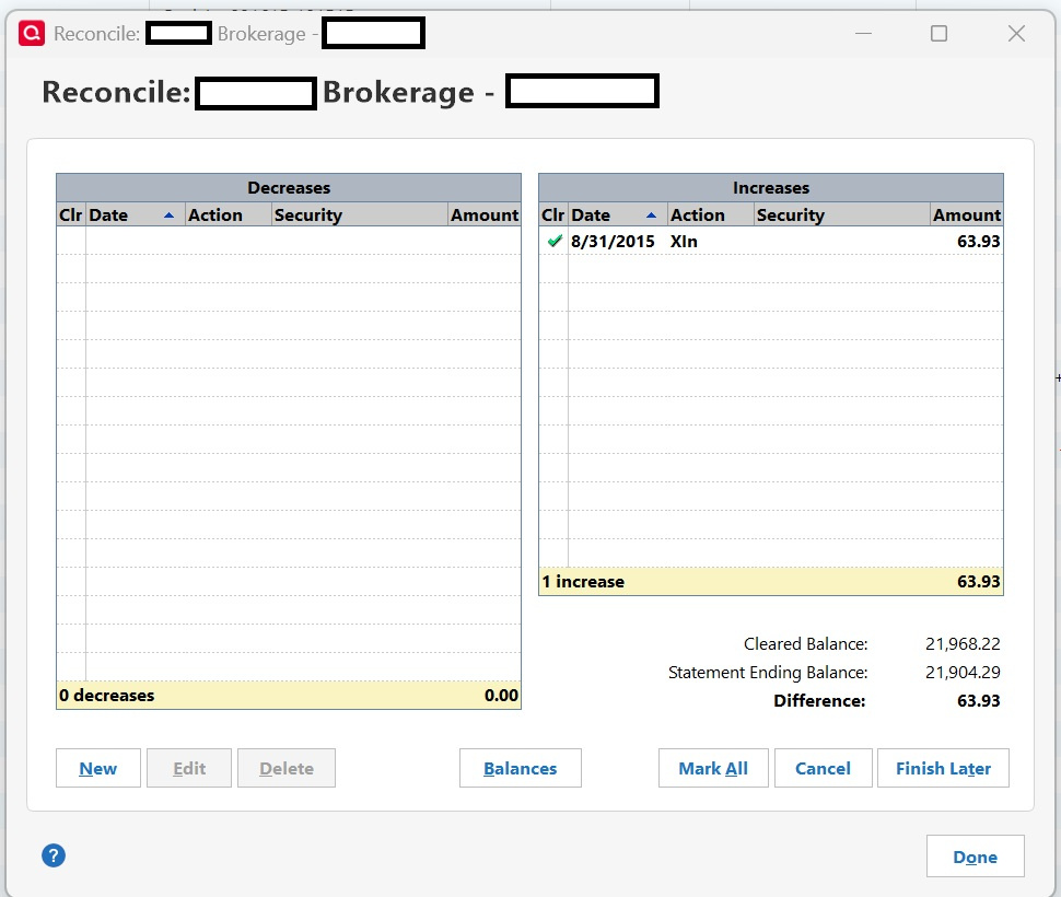 I am attempting to bring a very old brokerage account up to date through reconciliation. Unfortunately, due to the age of the account I do not have access to all of the statements. The best data I have begins 10 years ago. So, I am attempting to 'reset' the account and begin in August, 2015. The inventory of stock and the amount of shares matches the statement. The cash balance is off a bit. To bring in alignment I entered a XOut transaction so now the cash balance matches the statement.
