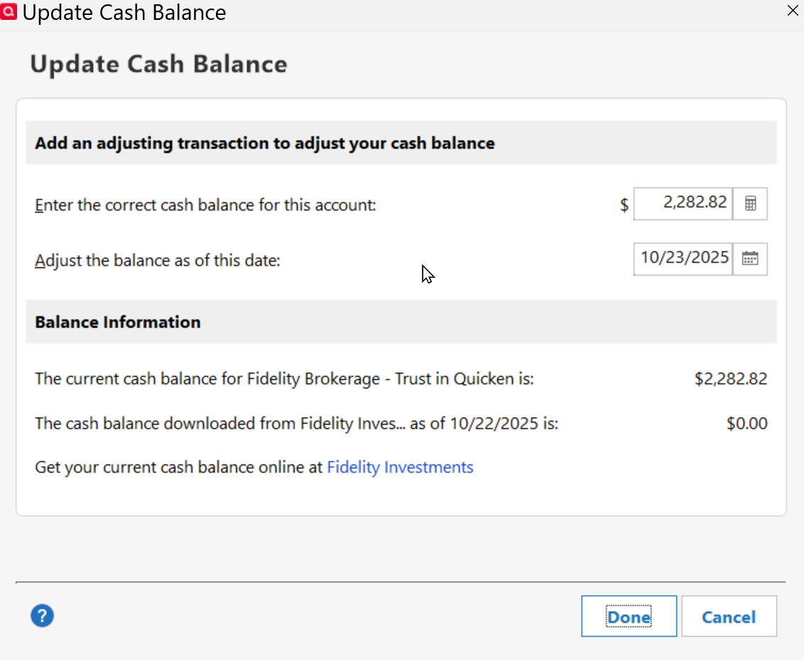 Most of my accounts don't handle the cash balance properly. I appears the only account that does uses the SPAXX fund as cash. The others using FZFXX and FDRXX don't. Issues like the monthly interest payment showing as a Reinvested Dividend back to the fund instead of a Dividend to the cash balance. Every time I reconcile it shows a warning window with the full fund balance reported by Fidelity and zero $ in Quicken. Quicken does not provide me with either of the two ways to fix this (clicking the blue cash balance on the account register screen or clicking the Online tab in the account setup window) for these accounts but does for my SPAXX account.