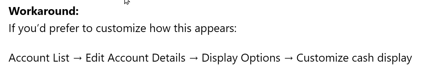 Yep, except the workaround listed is not relevant. On my Brokerage account (Edict Account Details-Display Options) there is no "Customize cash display.