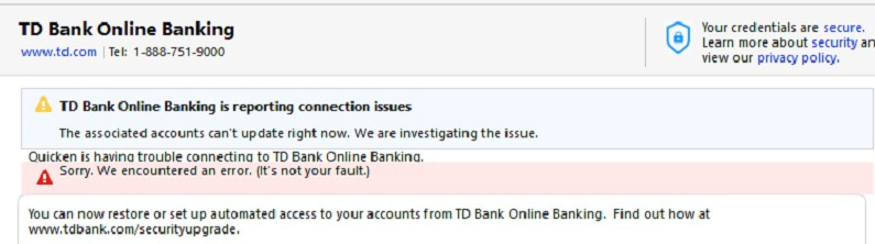 Until a couple of months ago I was able to connect to TD Bank Online and pay bills through Quicken. This stopped working with different error messages, the latest being TD Bank is reporting connection issues, we are investigating and it’s not your fault.
