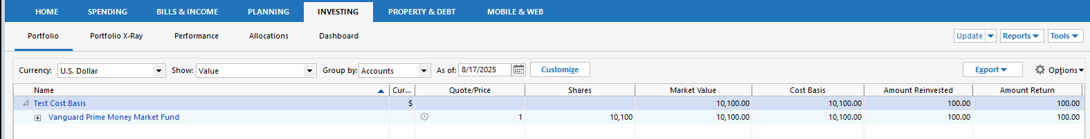 But, the cost basis of these shares is showing in Quicken as $36,458.53 for a loss of ($360.66).