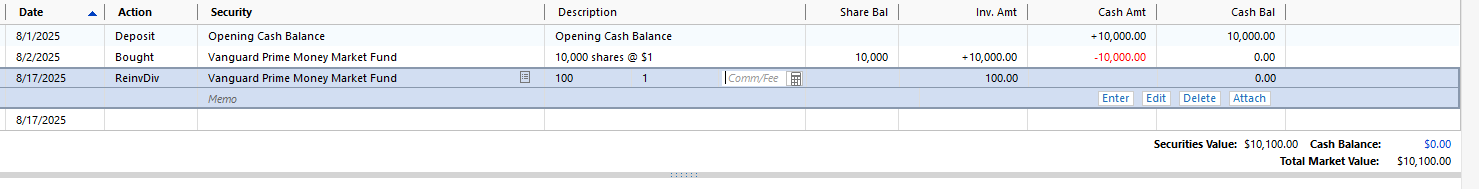 For a clearer picture on Quicken, you can also do a cash dividend and a purchase of shares, instead of the dividend reinvestment.