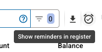 First, navigate to the register you need the reminder entered into. Make sure that "Show reminders in register" is on and allows a timeframe that will make the reminder visible.