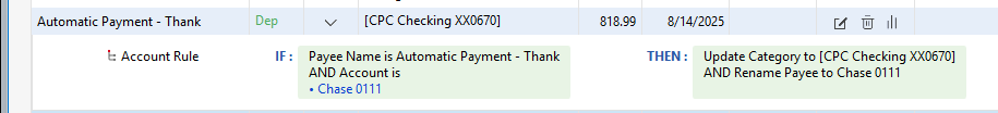 The new memorized payee features let me state what account to use a memorized payee in. This is important because the checking account and the credit card are from Chase and the payees are the same. I only want this to kick in, for the credit card account, and then the checking account will just match the transaction/transfer that is created by the downloaded transaction in the credit card account and the memorized payee.