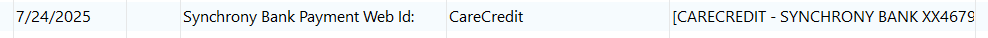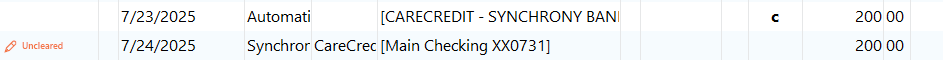 Go to the other account, the carecredit account, and note the new transaction added with the red pencil;