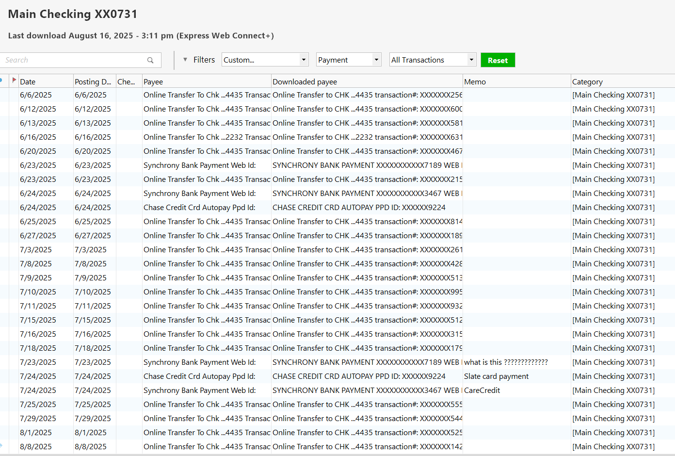 Note I haven't seen this problem is a while. Part of that might be that I was able to change my process given the new memorized payee features recently introduced.