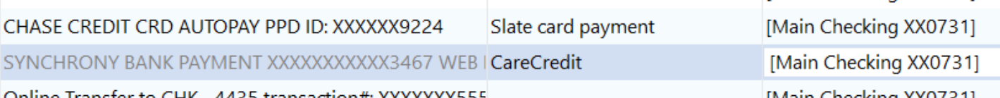 - Change the category in the main checking account to the correct account name. This creates a matching transaction in the other account, say my carecredit card account