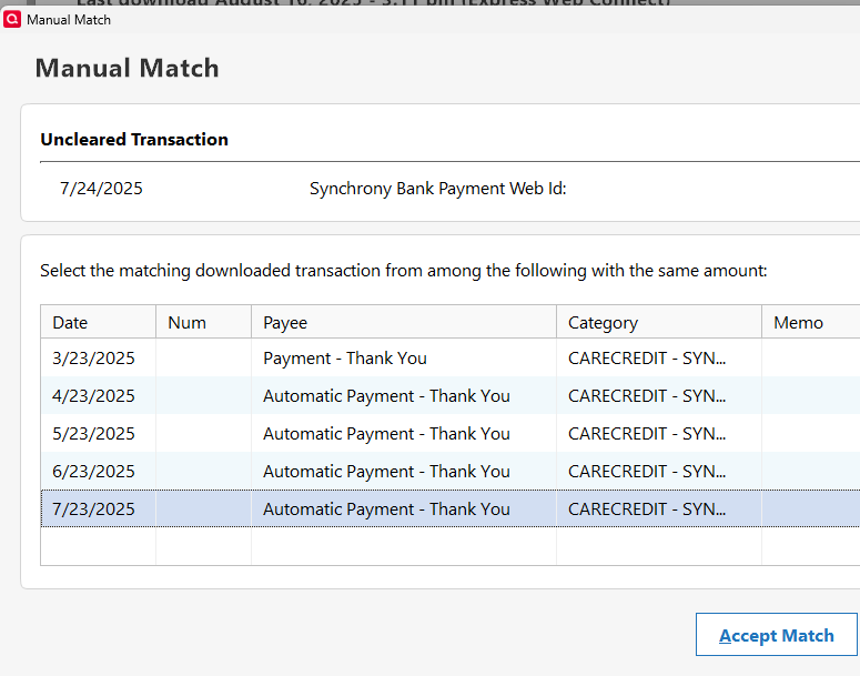 I tried clicking on the red pencil, and click on "match to a downloaded transaction (can't do a screen print , sorry) to do a manual match: