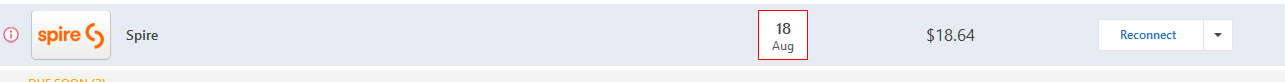 Spire Energy does not appear in the biller list but shows up on the bills page with "Reconnect"